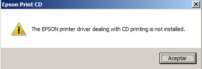 - Si ve el mensaje “The EPSON printer driver dealing with CD printing is not installed”, dar clic en [Aceptar].